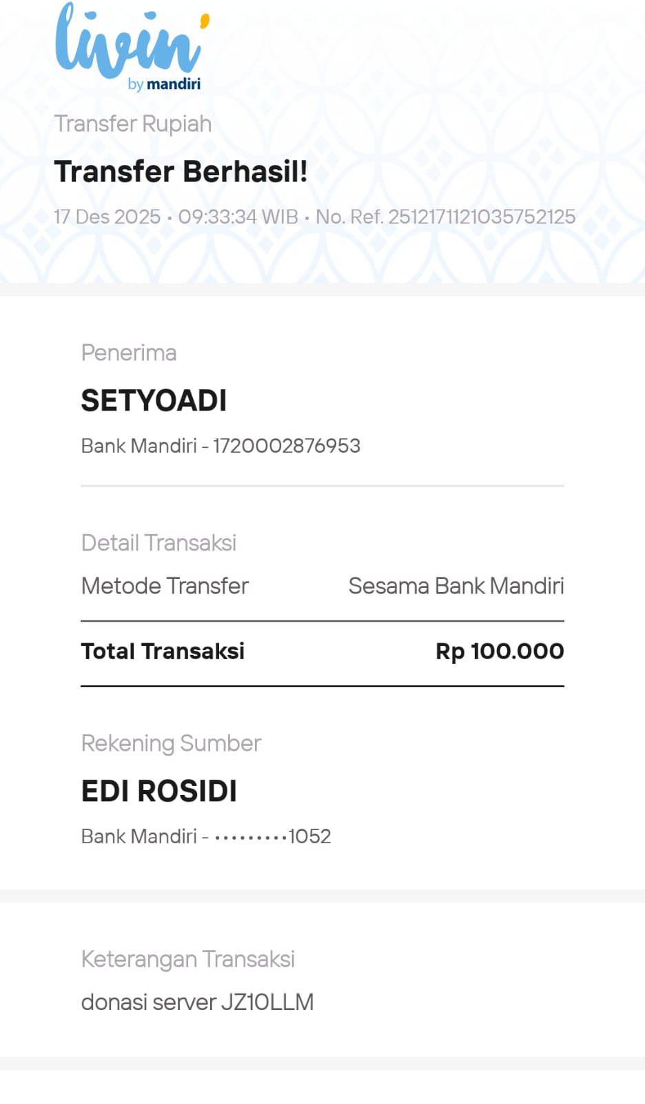 | 4 | 17-12-2025 | Rp 100.000,- | - | Donasi Server ROIP MERDEKA dari JZ10LLM | Ada | - |