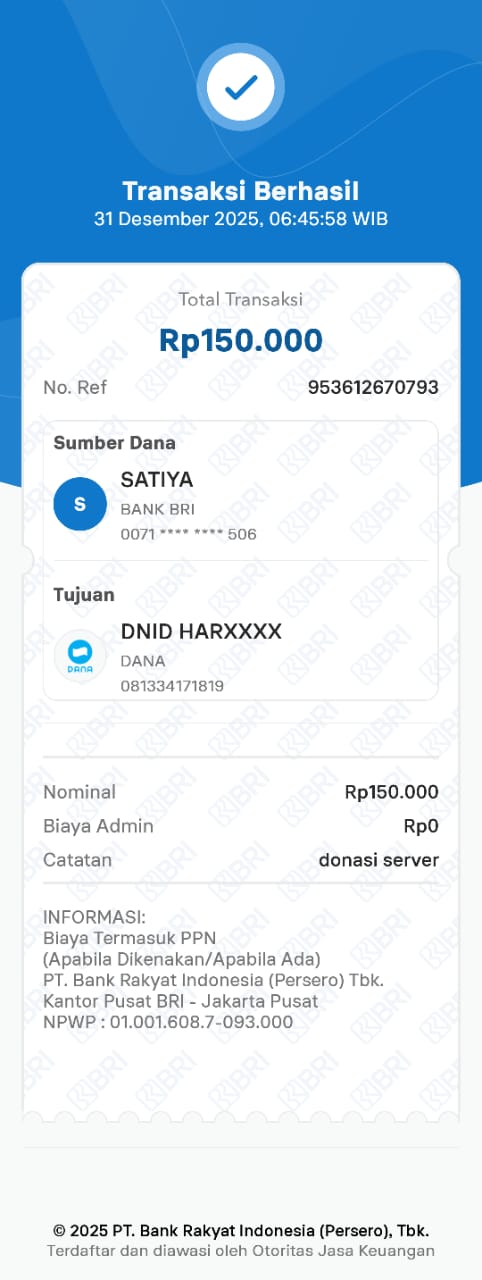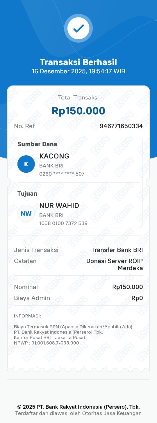 | 6 | 16-12-2025 | Rp 150.000,- | - | Donasi Server RoiPMERDEKA dari JZ26ALK | Ada | - |
