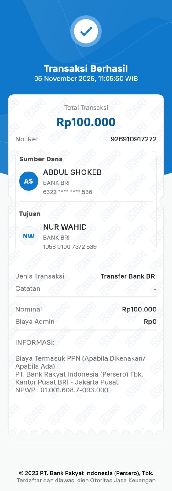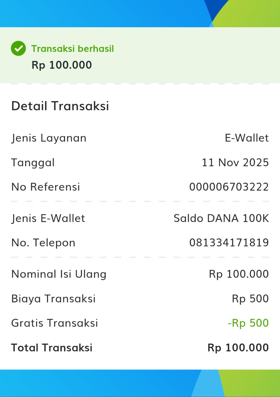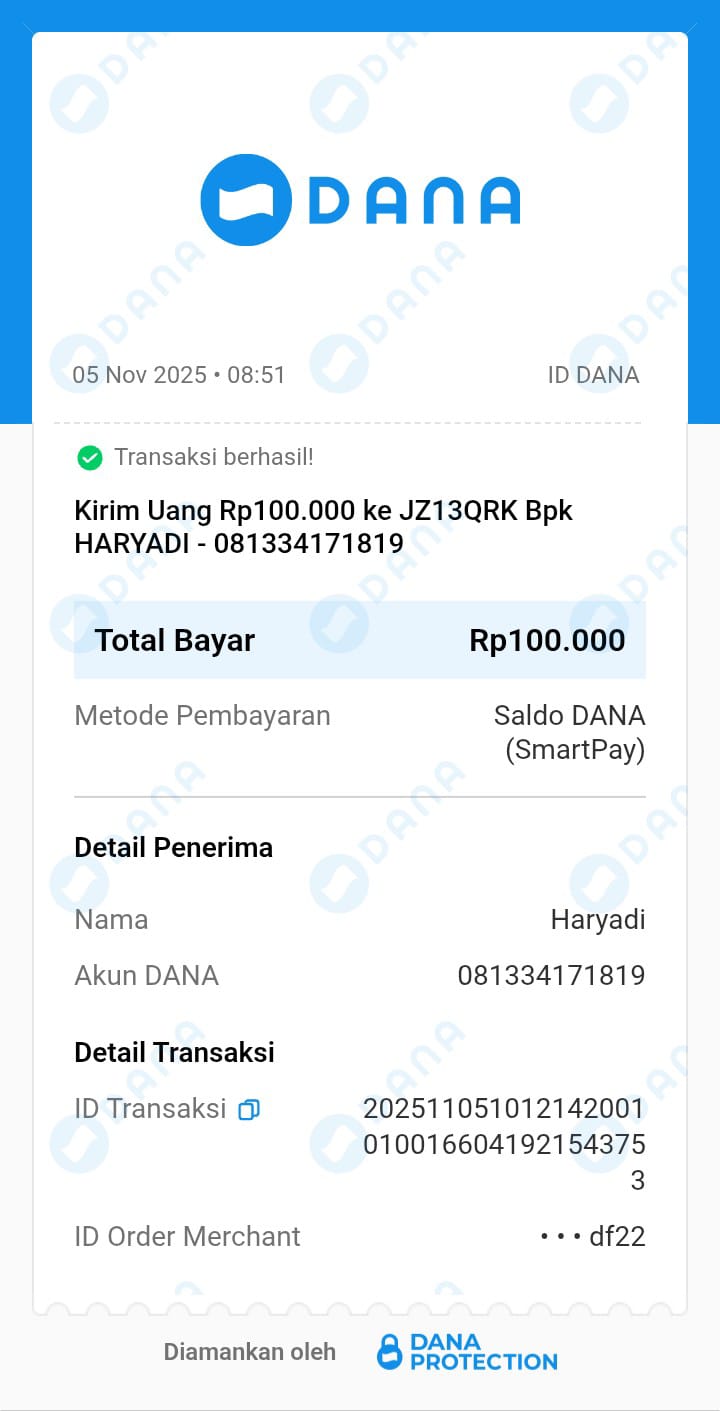 | 6 | 11-11-2025 | Rp 100.000,- | - | Donasi Server Roip Merdeka dari JZ10BZU | Ada | - |