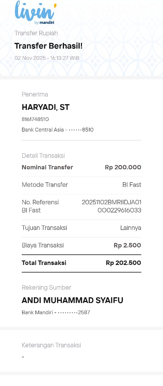 | 11 | 02-11-2025 | Rp 200.000,- | - | Donasi Server RoipMerdeka dari JZ24UAK | Ada | - |