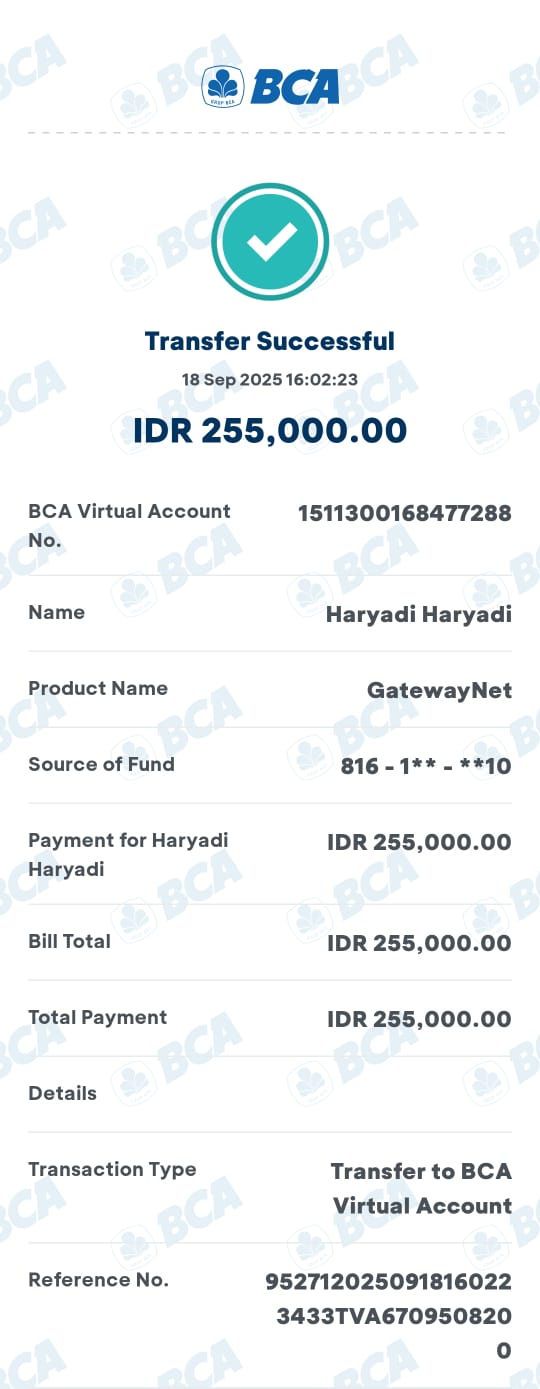 Kunjungi situs: https://ibank.klikbca.com/User ID: HARYADIS3110. PIN Internet Banking: 123456