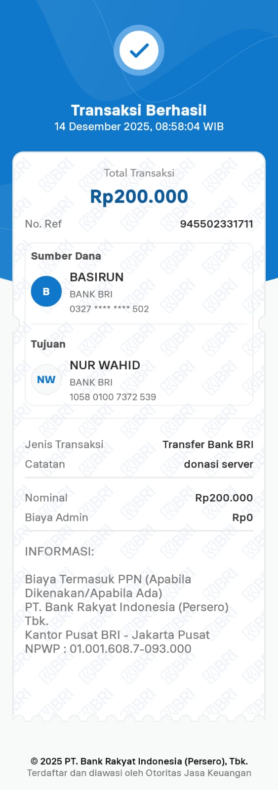 | 9 | 16-12-2025 | Rp 200.000,- | - | Donasi SERVER ROIP MERDEKA dari JZ30CFP | Ada | - |